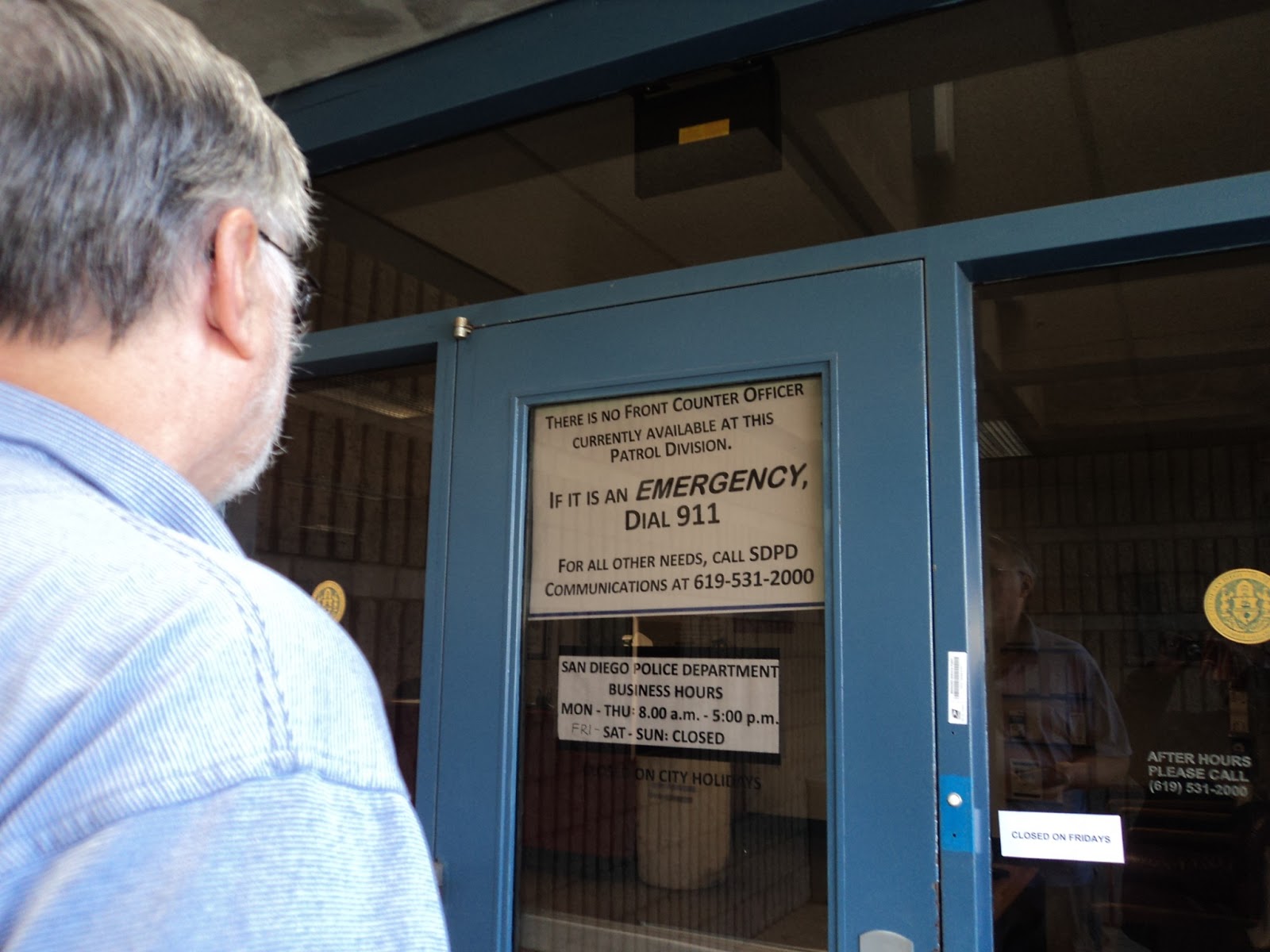 Low and behold...the station was CLOSED! what!!?? How do you close a police department??? On the weekend no less in a big city like San Diego?? I thought I was back in BC.....